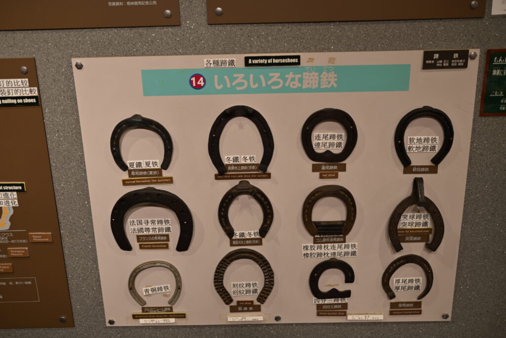 普段目にする競走馬の蹄鉄と違って様々な種類の蹄鉄が使われている。