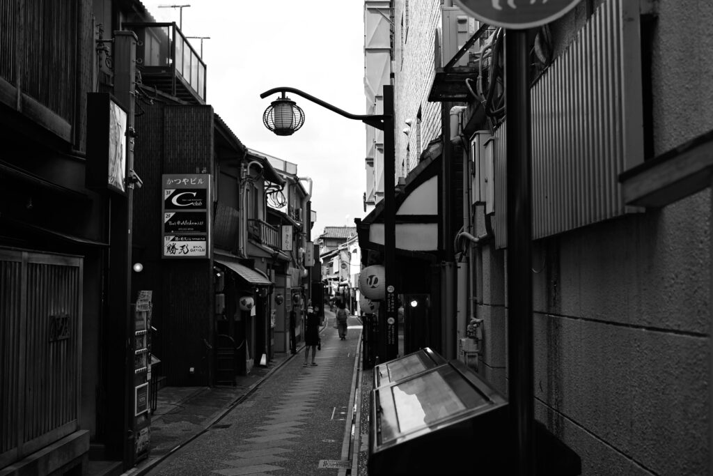 祇園の路地に入り込むと表の通りとは打って変わって、人影も減ってきた。